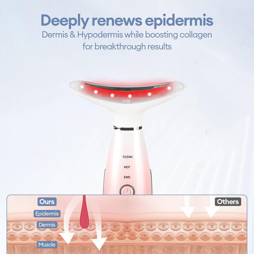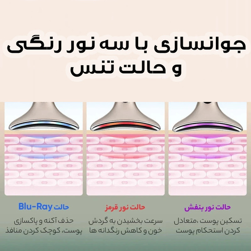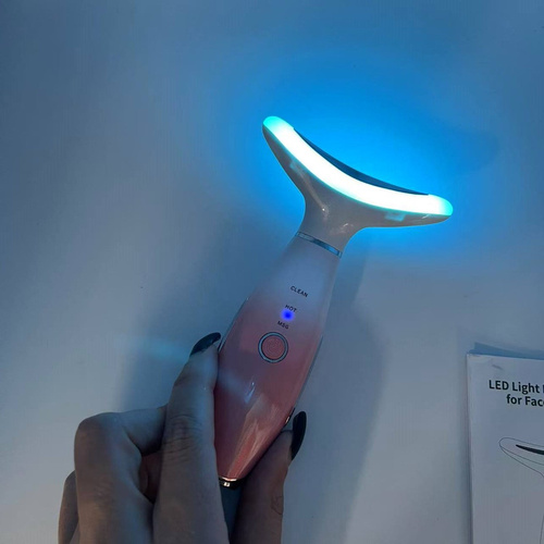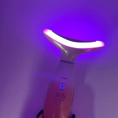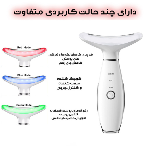 این دستگاه ماساژ صورت با قابلیت گرمایش و ویبره (3 حالت کاری)* دستگاه مراقبت پوستی یک دستگاه پیشرفته با طراحی ارگونومیک که برای پاکسازی عمقی، ماساژ و بهبود گردش خون پوست صورت طراحی شده است. این دستگاه با حالت های متفاوت و گرمای ملایم، به جوانسازی و افزایش کشش پوست کمک میکند. دارای 7 نور درمانی است که رنگ آبی که سرد ترین رنگ است که میتواند باعث کلاژن سازی، افزایش انعطاف پذیری پوست و بهبود حساسیت پوستی شود. رنگ سبز باعث افزایش متابولیسم سلولی، افزایش جریان لمف و لطافت پوست میشود. رنگ قرمز باعث تقویت توان زیستی سلولها، افزایش جریان خون و تحریک فیبروبلاست میشود و همچنین تاثیر چشمگیری روی رفع خطوط عمیق، چین و چروک، خشکی پوست، افتادگی پوست، لکهها و جای زخم و همچنین جوانسازی پوست دارد. مدت زمان استفاده: هر رنگ نور 10 دقیقه روزانه استفاده شود